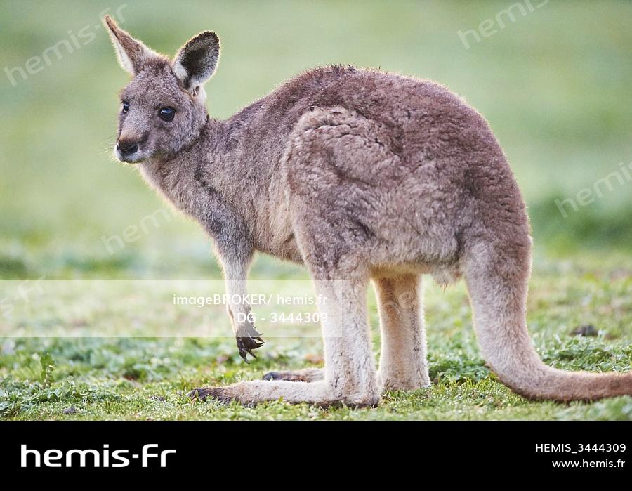 Eastern grey kangaroo -Macropus giganteus- standing on a meadow, Victoria, Australien