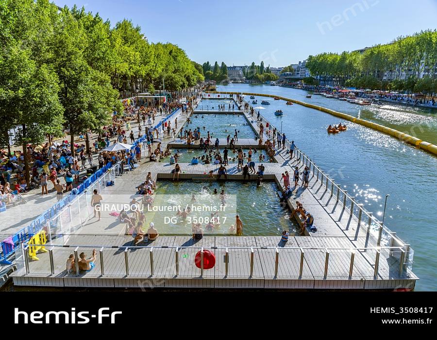 France, Paris, Paris Plage, summer swimming pool on the Ourcq canal, Quai de la Marne