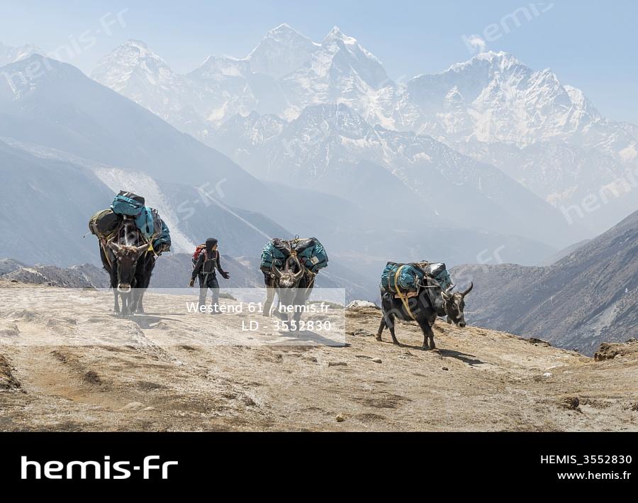 Nepal, Solo Khumbu, Everest, Dingboche, Sherpa guiding pack animals through the mountains