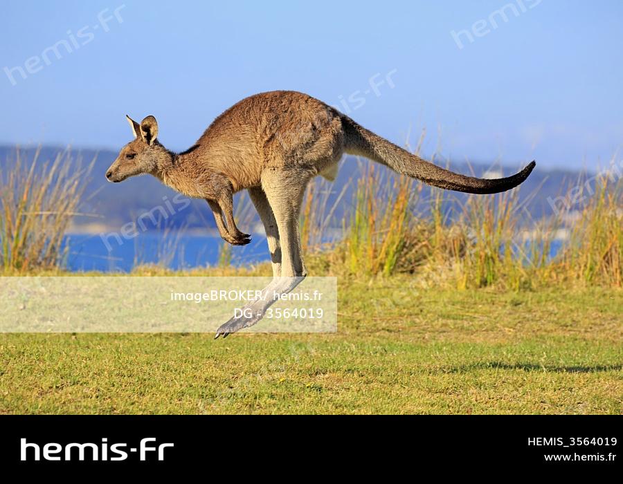 Eastern grey kangaroo -Macropus giganteus-, adult, jumps over green meadow, Maloney Beach, New South Wales, Australia, Oceania