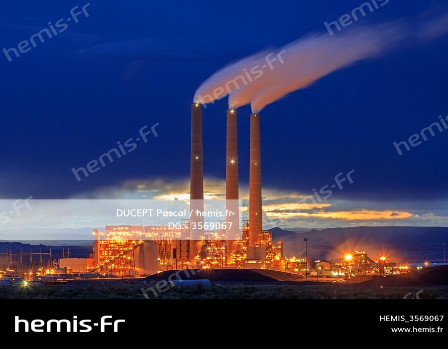 United States, Arizona, Navajo Indian Reservation, steam rises from the three-unit, 2250-megawatt Navajo Generating Station coal-fired powerplant east of Page