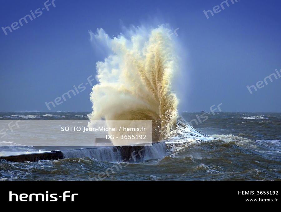 France, Morbihan, Ploemeur, Port de Lomener, wave on the dike during a storm