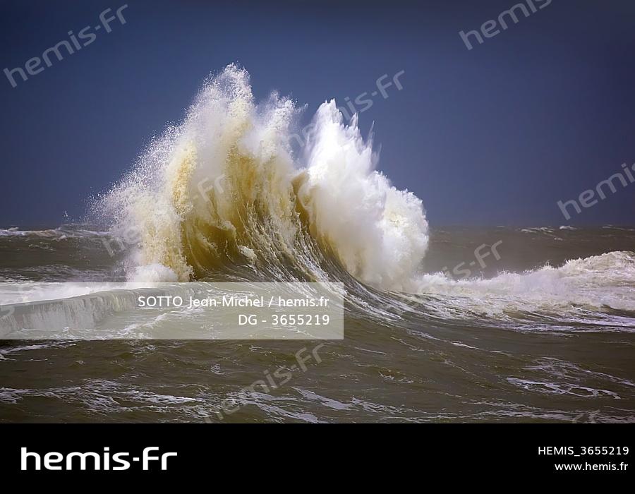 France, Morbihan, Ploemeur, Port de Lomener, wave on the dike during a storm