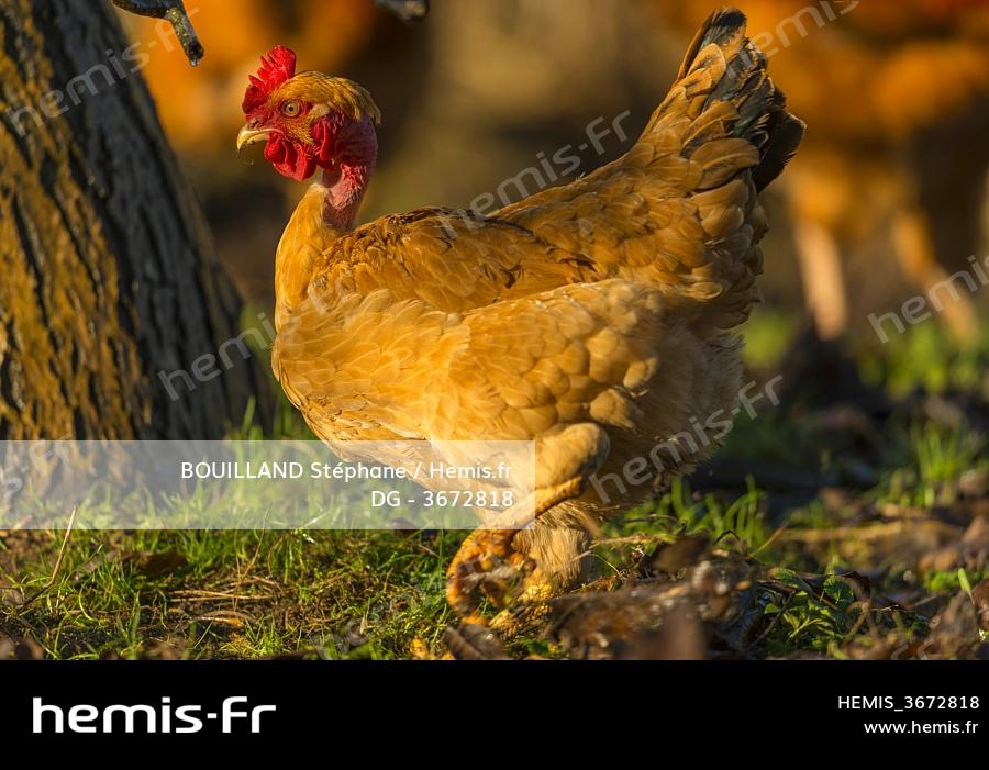 France, Ardennes (08), Carignan, Poulets de race "Cou-nu", Poulets (Poules et coqs) de chair dans un élevage traditionnel "bio" à la ferme
