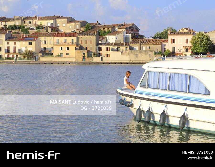 France, Aude, Castelnaudary, Canal du Midi, the port with a barge