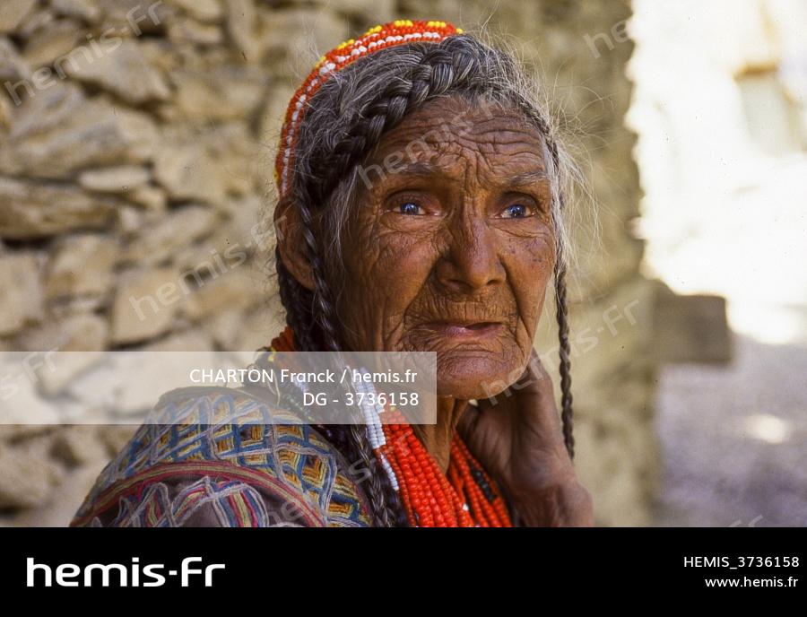 Pakistan, Hindu Kouch massif, Chitral province, border with Afghanistan, villages and refuge-valleys of the Kalash or Kalasha, a hindu-european people of polytheistic religion, endangered, as the last non-Muslim tribe of Pakistan, old woman evoking the difficulty of continuing to dance and sing, during the feasts, under the pressure of local mosques