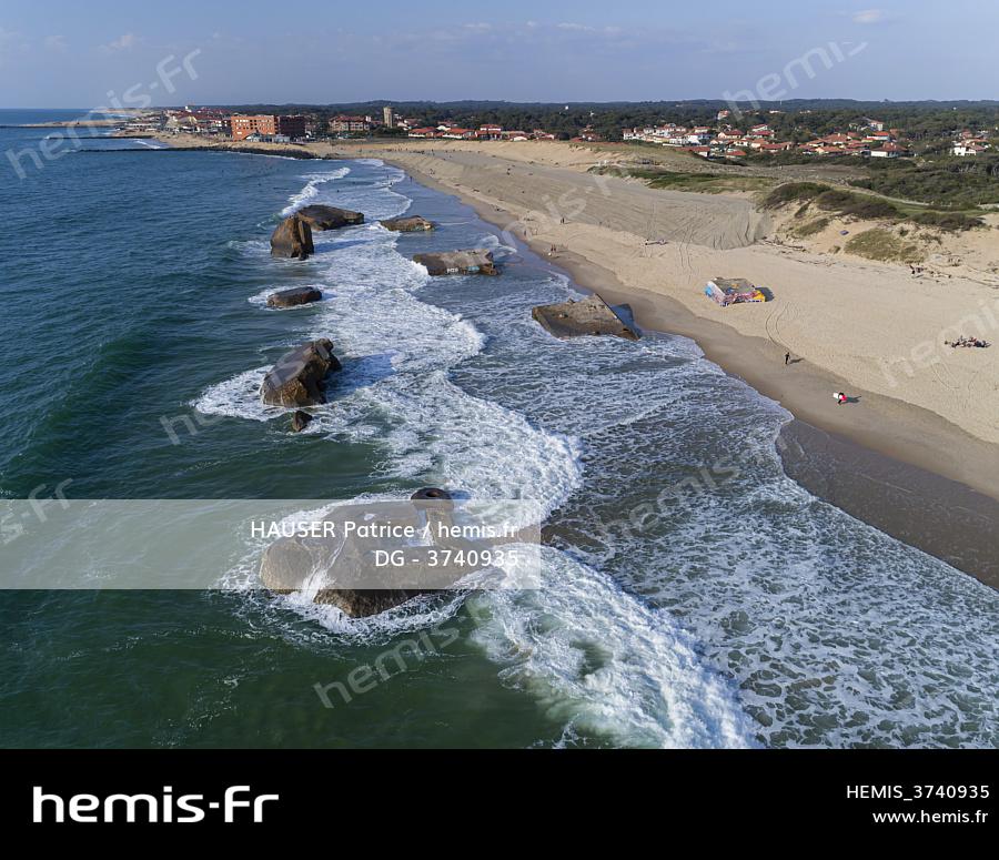 France, Landes, Capbreton, Savannah beach (Santocha) and its blockhouses (aerial view)