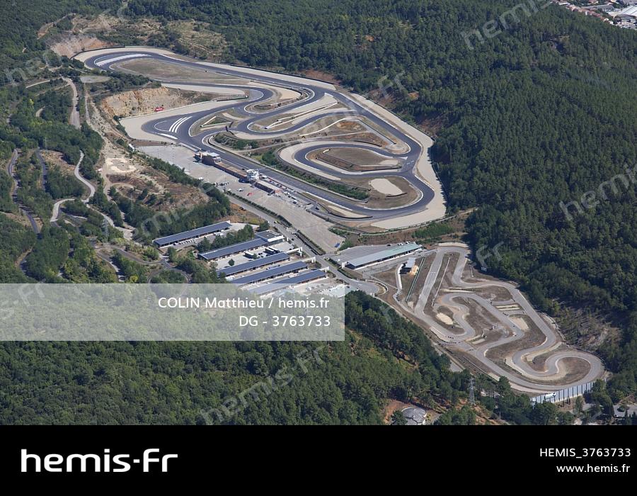 France, Gard, Ales, Ales Cevennes mechanical center, automobile complex comprising five “asphalt” and five “dirt” equipment, speed road circuit, karting circuit and rally tracks (aerial view)