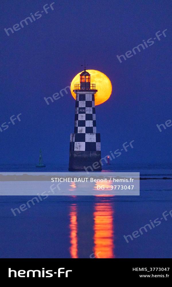France, Finistère (29), Loctudy, lever de pleine lune (super lune) sur la tourelle des Perdrix (phare des Perdrix)