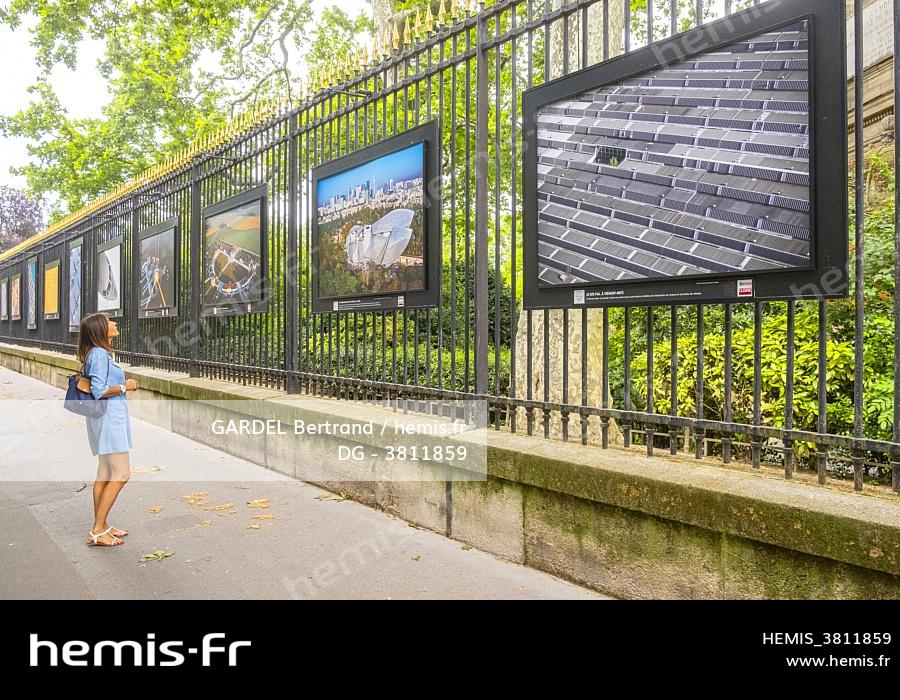 France, Paris (75), Jardin du Luxembourg, les grilles du Sénat, exposition "L'industrie vue du Ciel" en collaboration avec le magazine l'Usine Nouvelle