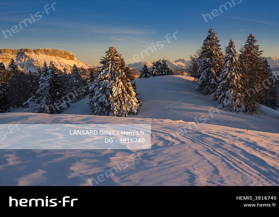France, Savoie (73) massif et parc naturel régional des Bauges, paysage hivernal près de la station du Revard, coucher de soleil sur le plateau et la montagne de Margeriaz (1845m)