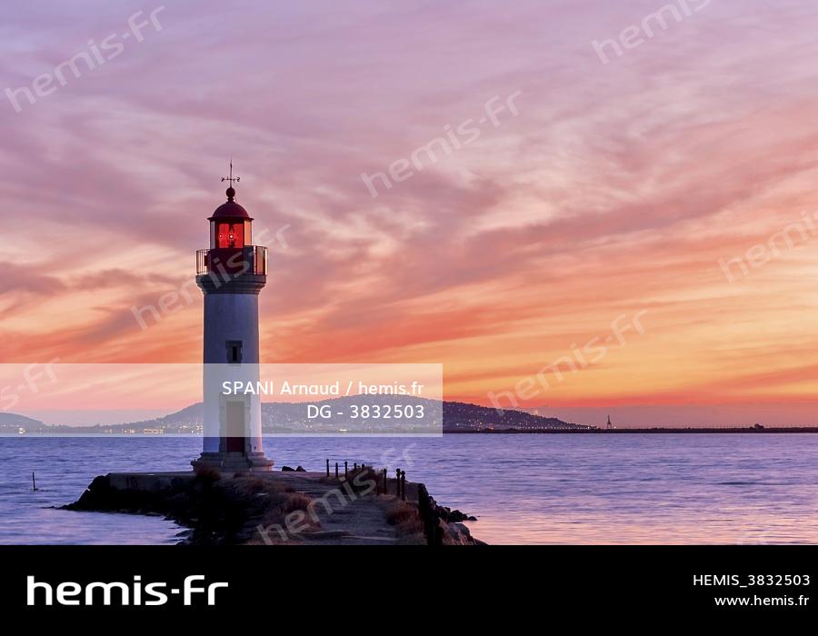 France, Herault, Canal du Midi, listed as World Heritage by UNESCO, Marseillan, Les Onglous, lighthouse at dawn