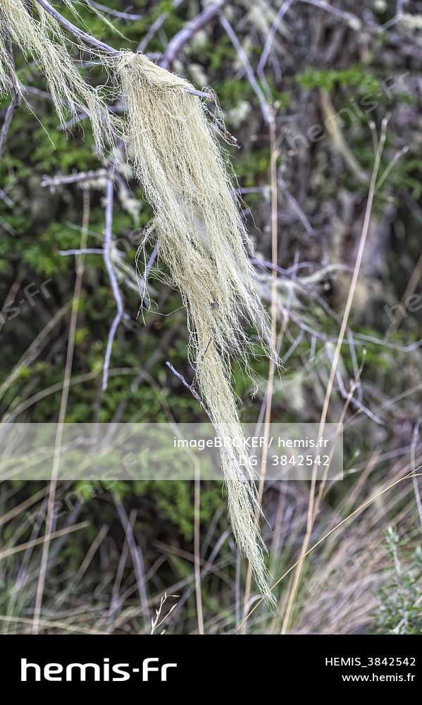 Les vieux hommes? S Barbe lichen (Asnea barbata) poussant sur un arbre, Parc National de Patagonie, vallée de Chacabuco près de Cochrane, région d'Aysen, Patagonie, Chili, Amérique du Sud