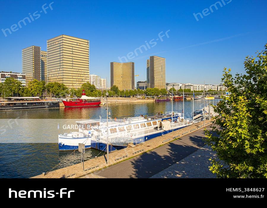France, Paris, Quai François Mauriac, the Bibliotheque Nationale de France (BNF), François Mitterrand site by architect Dominique Perrault and the Batofar, boat transformed into a musical café