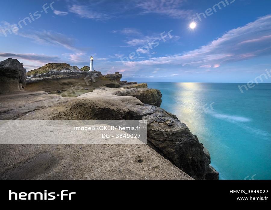Lighthouse at full moon on the cliffs of lava rock at Castlepoint, Masterton, Wellington, New Zealand, Oceania