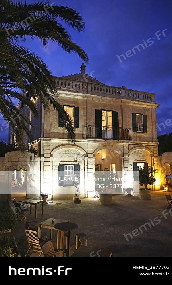 Spain, Balearic islands, Minorca, sant lluis, facade of the hotel Alcaufar Vell, a rural manor house dating back to the 18e century, illuminated at night