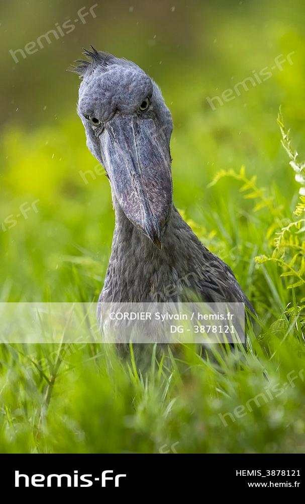 Ouganda, Marais de Mabamba, Bec-en-sabot du Nil (Balaeniceps rex), en chasse au dipneuste (protoptères = poissons osseux pulmonés qui s'enterrent dans la boue quand l'eau vient à manquer