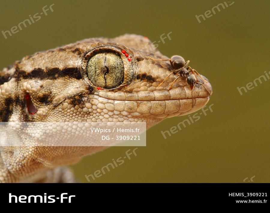 Moorish Wall Gecko (Tarentola mauritanica) with ant on mouth, Spain