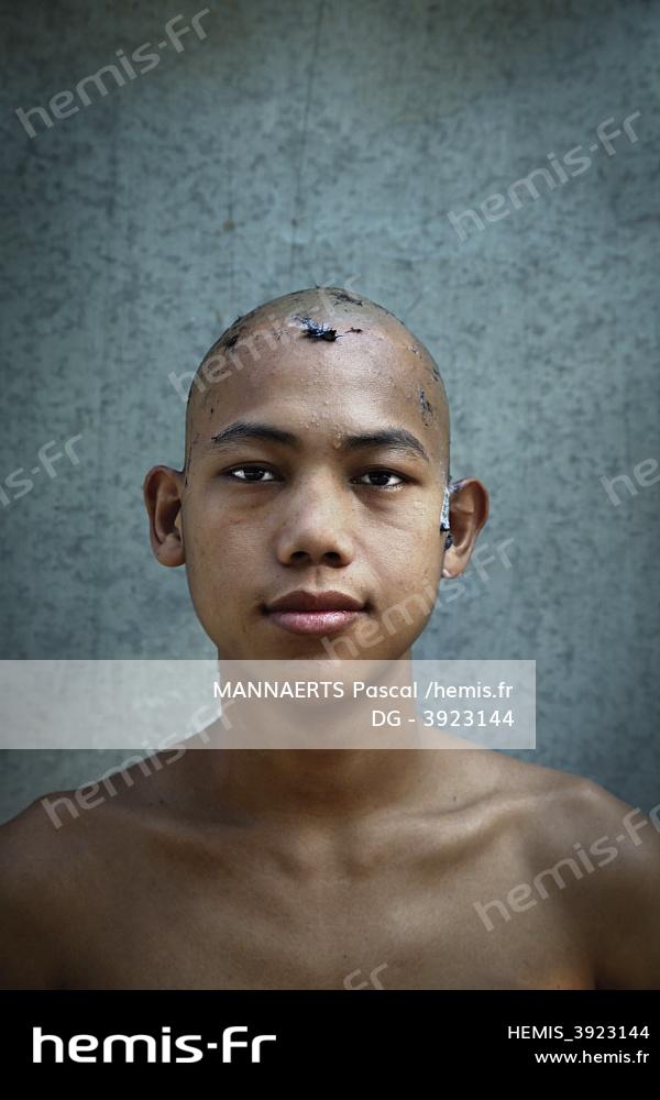 Myanmar (Burma), tonsure ritual at Amarapura monastery, portrait of bald monk