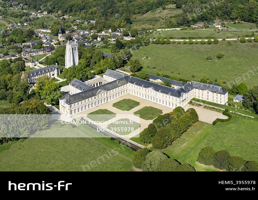 France, Eure, Le Bec Hellouin, labeled The Most Beautiful Villages of France, abbey Notre Dame du Bec, catholic benedictine Abbey, the Tower Saint Nicolas (aerial view)