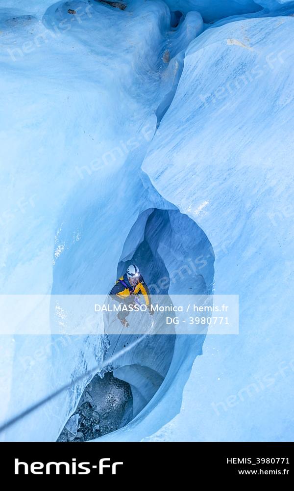 France, Haute Savoie, Chamonix Mont Blanc, Mer de Glace, glaciologist Luc Moreau rappelling inside a moulin, a moulin is a shaft carved into a glacier by meltwater and rainwater on the surface and through which it passes to reach a network of intra and sub glacial galleries