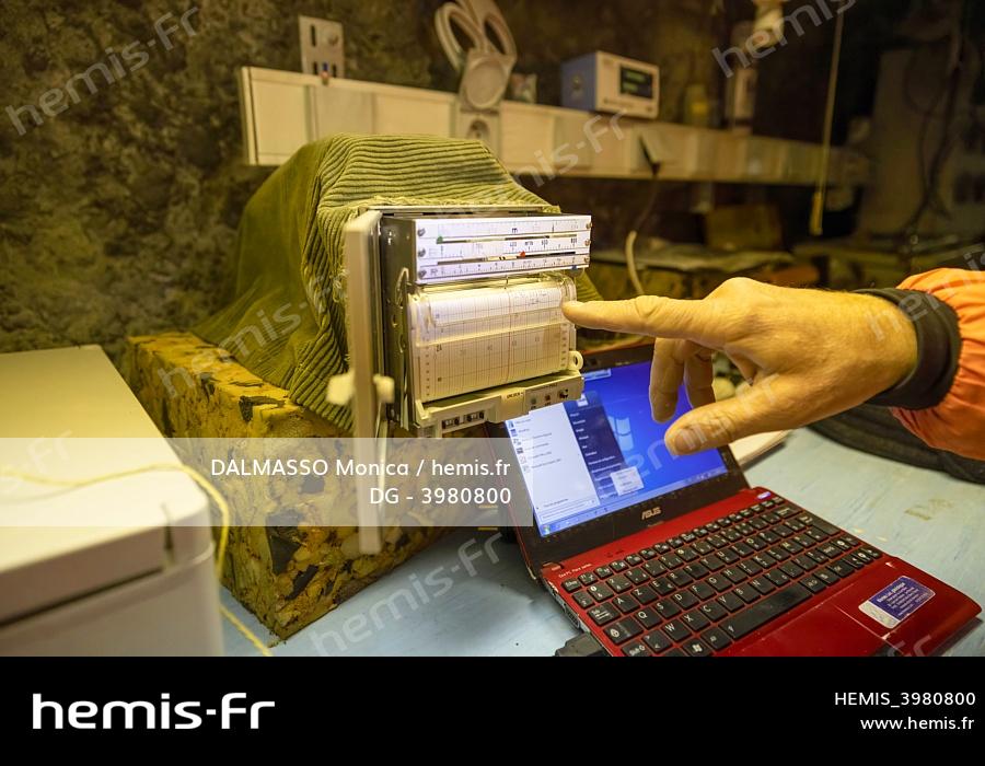 France, Haute Savoie, Chamonix Mont Blanc, Argentiere Glacier, Luc Moreau, glaciologist, in his lab under the Argentiere Glacier, a paper tracing of the measurements taken by the bicycle wheel, a straight trajectory indicates that the glacier is advancing regularly
