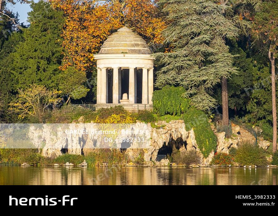 France, Paris, Bois de Vincennes in autumn, Lac Daumesnil, the romantic temple of the island of Reuilly , romantic temple on Reuilly island