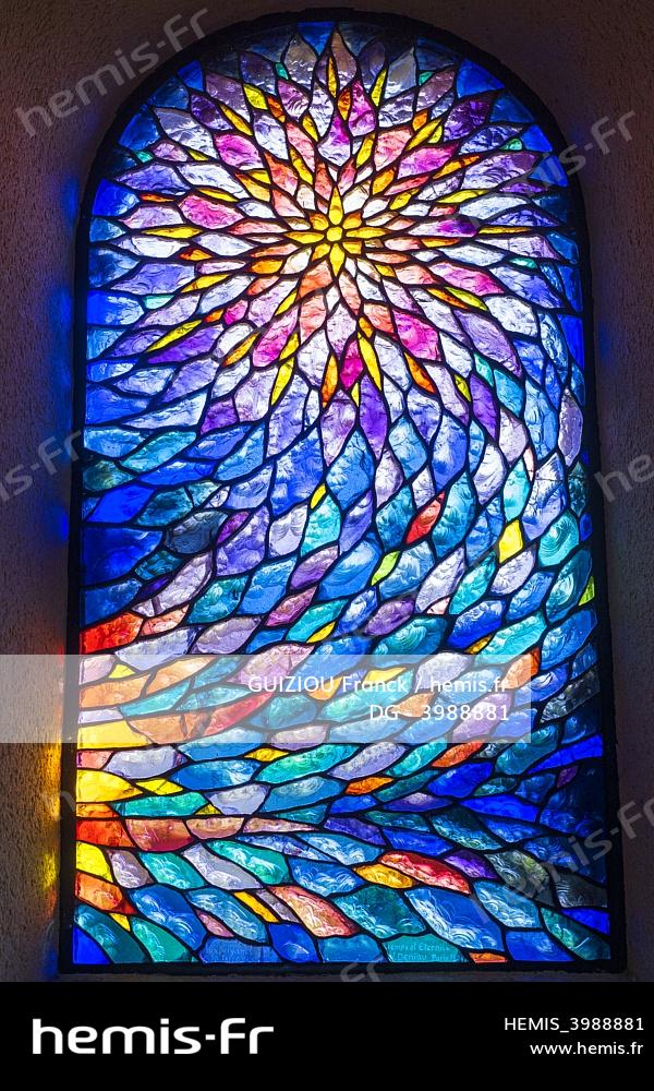France, Aveyron (12), Noailhac sur la Via Podiensis, un des chemins de Compostelle ou GR 65, vitrail de la chapelle Saint-Roch conçu par le maître verrier Victor Loup Deniau