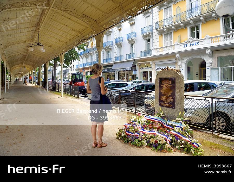 France, Allier (03), Vichy, classée Patrimoine Mondial de l'UNESCO, galerie couverte dans le parc des Sources, l'ancien Grand Hotel du Parc abritait le siège du gouvernement du régime de Vichy, Philippe Pétain et de Pierre Laval pendant l'occupation, mémorial aux juifs déportés