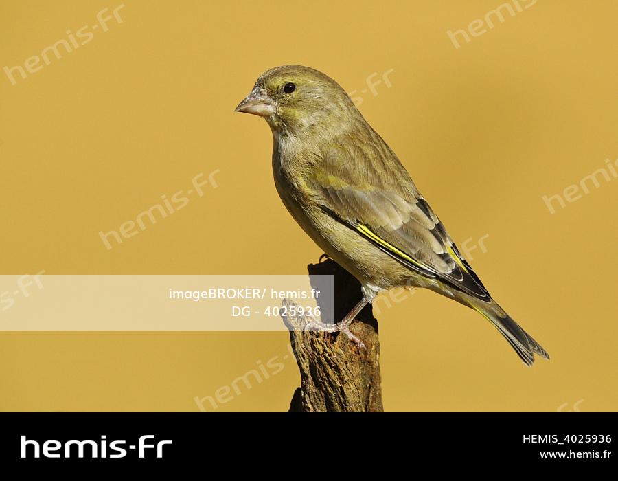 European greenfinch -Carduelis chloris-, Female on a root, Siegerland, North Rhine-Westphalia, Germany, Europe