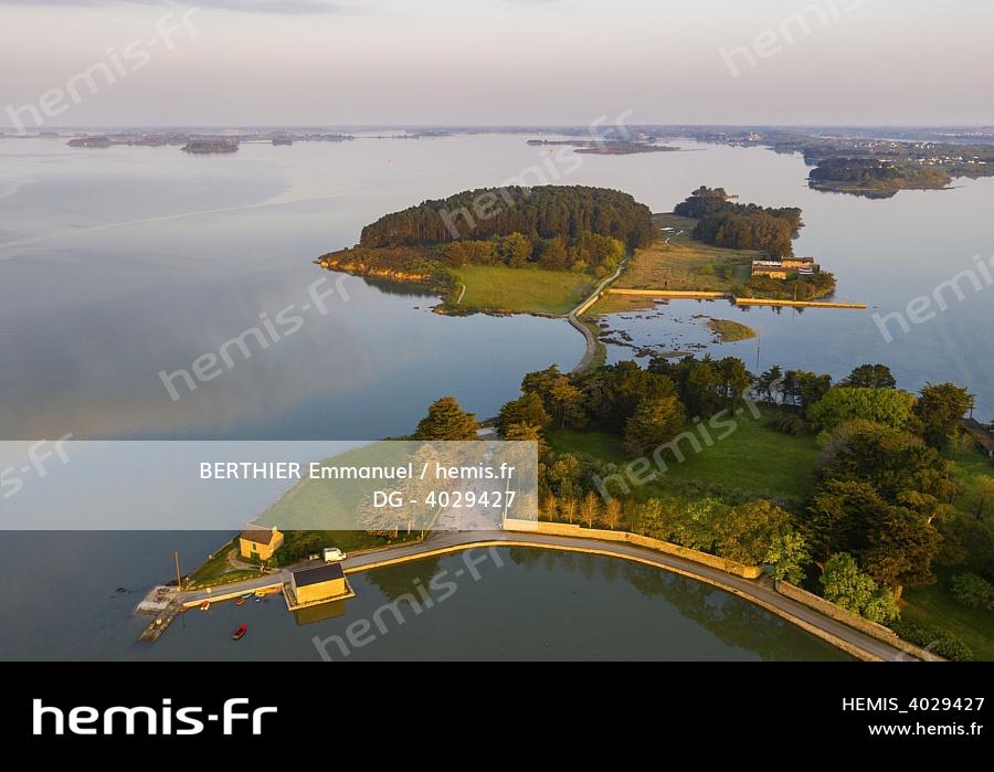 France, Morbihan, aerial view of the Golf of Morbihan above Montsarrac at dawn (aerial view)