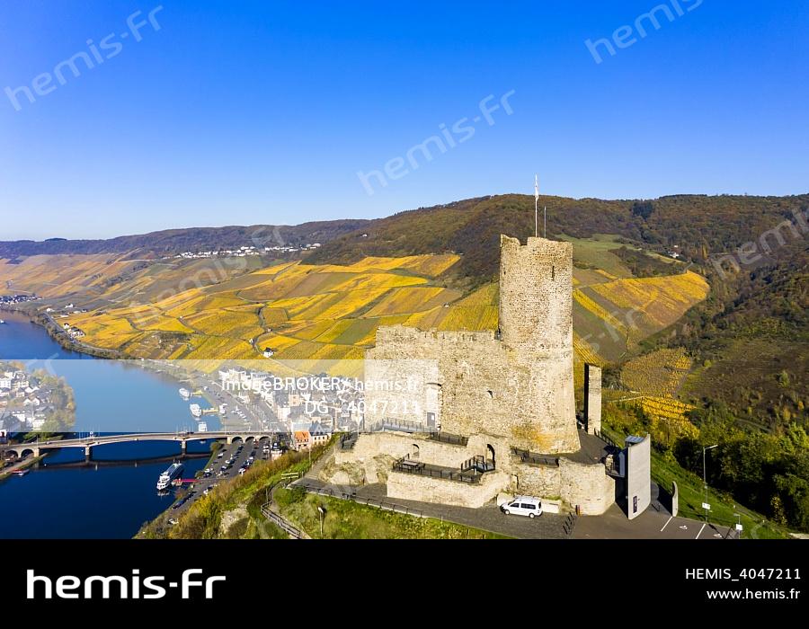 Aerial view of Landshut castle ruins above the Moselle, Bernkastel-Kues, Moselle, Rhineland-Palatinate, Germany, Europe