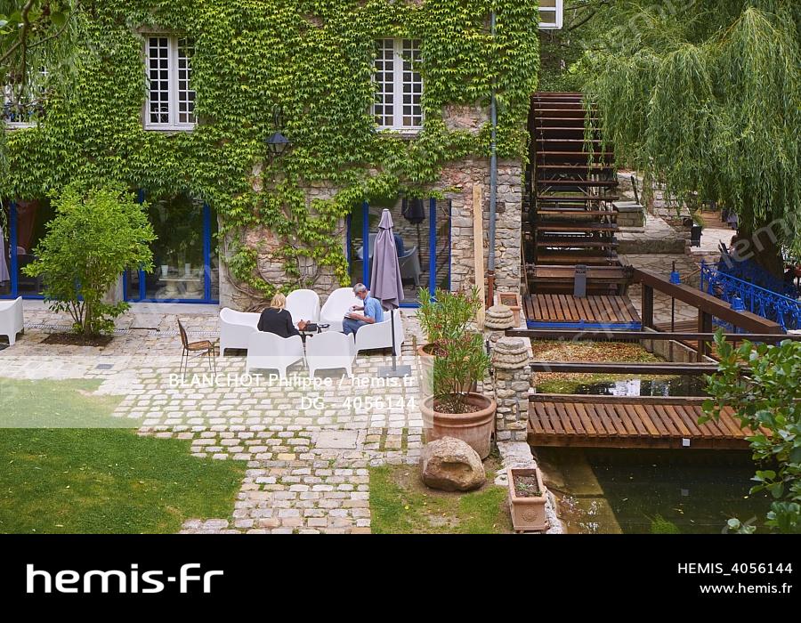 France, Essonne, Dannemois, Moulin de Dannemois, former home of the singer Claude Francois, the terrace, the bief and the paddle wheel