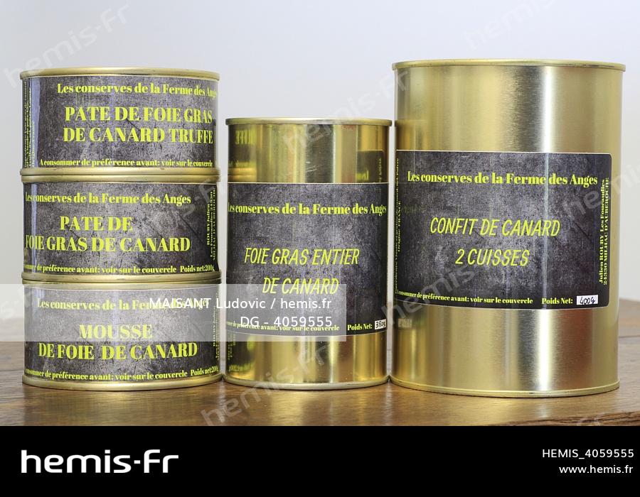 France, Dordogne, Central Perigord, Milhac d'Auberoche, Ferme des anges, preserves made on site with the farm's ducks (pâte de foie gras with truffles, pâte de foie gras, mousse of foie gras, whole foie gras and duck confit)
