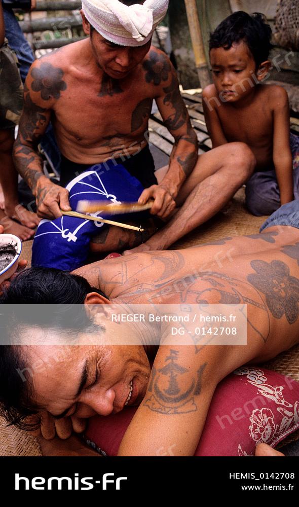 Malaysia, Borneo island, Sarawak, Dayak warrior (from the Iban) tribe traditional tattoo session