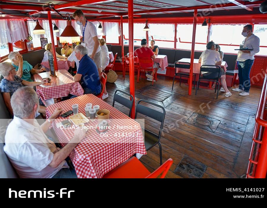 France, Hérault (34), Sète, Quai du Maroc, bateau-phare Roquerols, parcours Brassens, salle de restaurant sur le ponton arrière