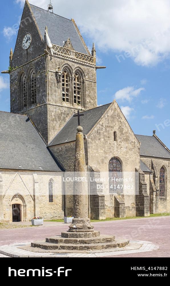 France, Manche, Sainte Mere Eglise, a parachute is visible on the steeple of the church in memory of Private John Steele