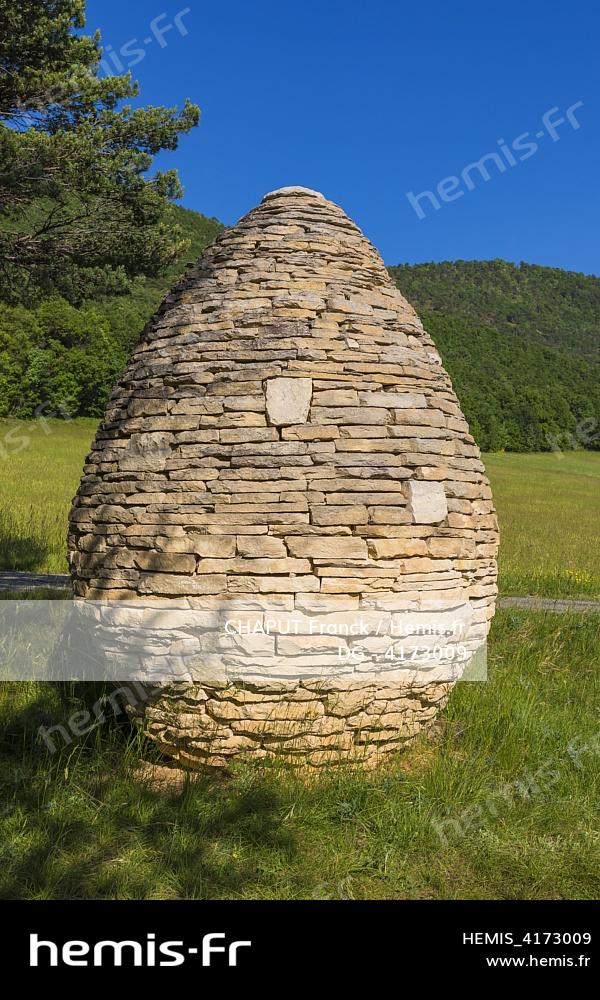 France, Alpes-de-Haute-Provence (04), Réserve Naturelle Géologique de Haute Provence, Vallée de l'Asse, Tartonne, Sentinelle, cairn de pierres sèches, oeuvre de l'artiste de land art Andy Goldsworthy