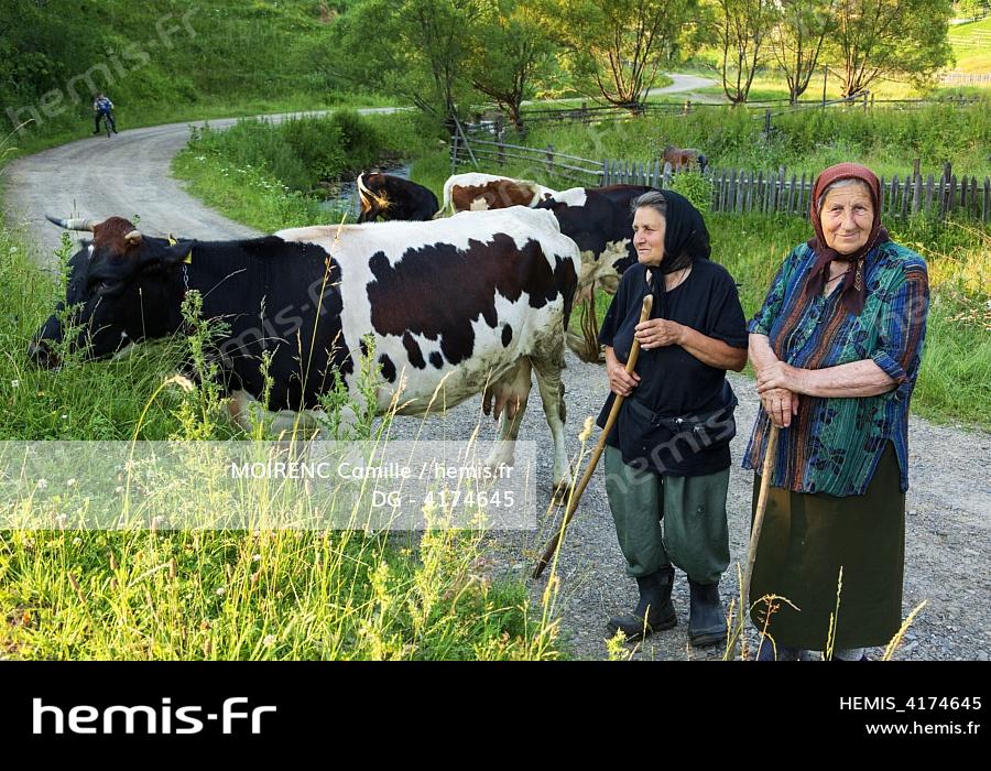 Romania, Bucovina, Ciumarna, Romanian women guarding their cows