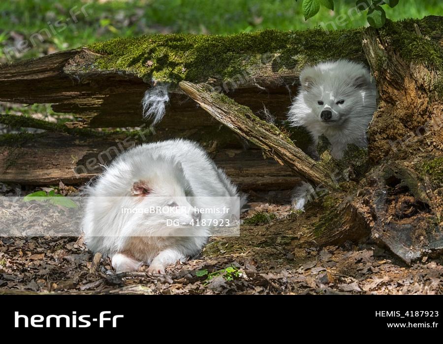 Two white Raccoon dogs -Nyctereutes procyonoides- resting under a tree trunk in the forest