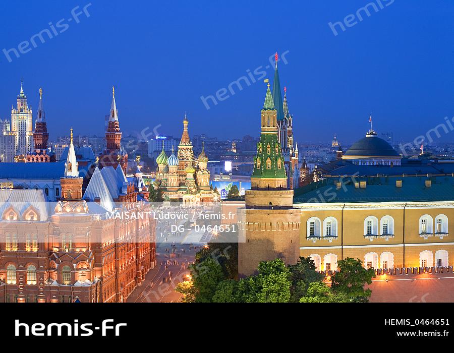 Russie, Moscou, hôtel Ritz-Carlton, vue sur la Place Rouge avec le Kremlin et la cathédrale de Basile le Bienheureux depuis la terrasse du restaurant bar 02 Lounge du Ritz-Carlton
