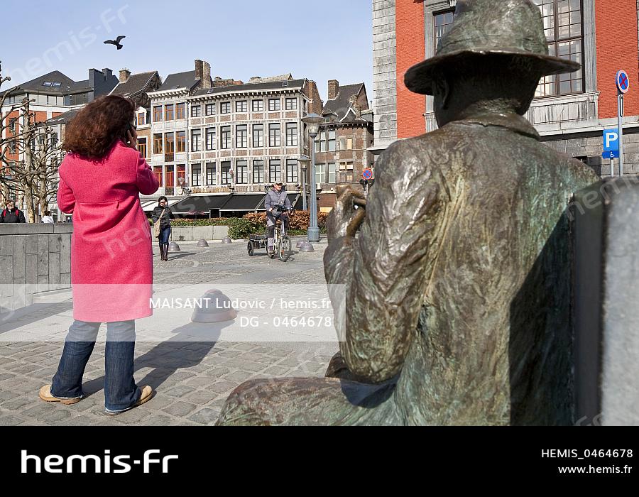 Belgium, Walloun region, Liege, statue of writer Georges Simenon by sculptor Roger Lenertz behind the townhall