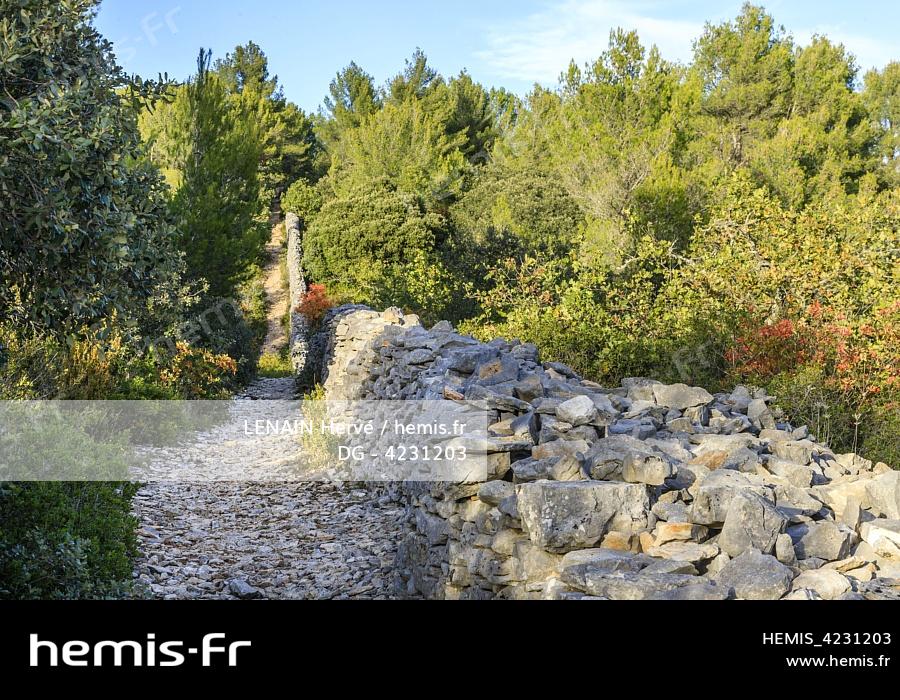 France, Vaucluse, Parc Naturel Regional du Luberon (Luberon Natural Regional Park), Lagnes, Cabrieres d'Avignon, the Wall of the Plague of the 18th century built in dry stone, wall built over 20 km from Cabrieres to Monieux