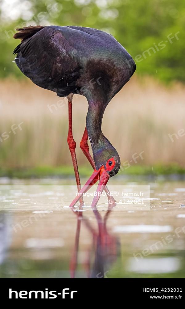 Cigogne noire -Ciconia nigra- Vieil oiseau en quête de nourriture, pêche dans l'eau, peignant l'eau pour se nourrir, Parc National de Kiskunsag, Hongrie, Europe