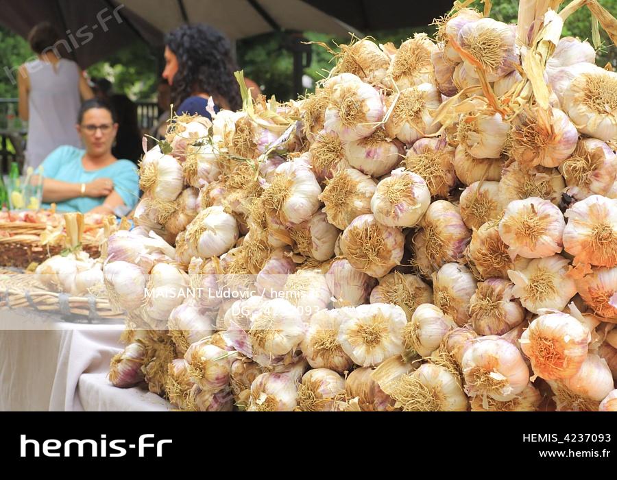 France, Alpes de Haute Provence, Forcalquier, pink garlic in braid on the market