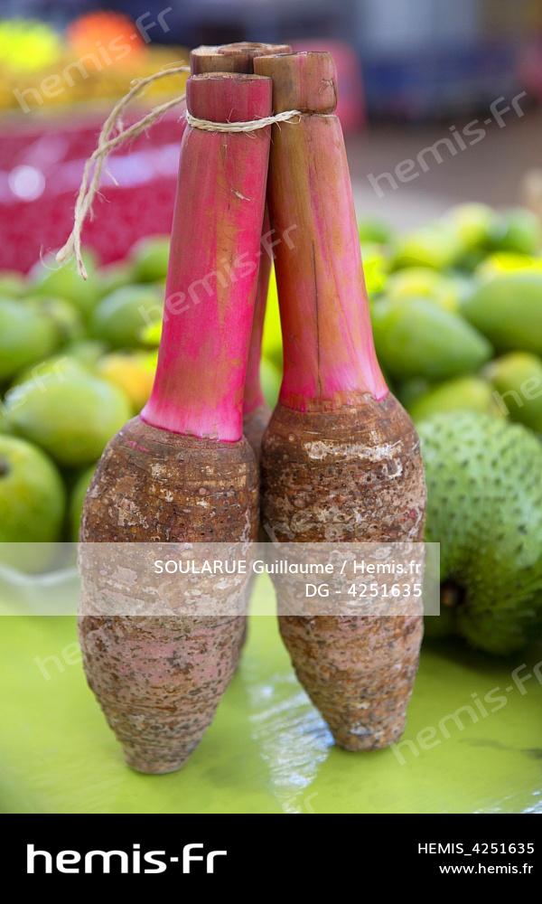 Polynésie Française, île de Tahiti, Papeete, taro rose, la patate polynésienne, sur un étal du marché municipal