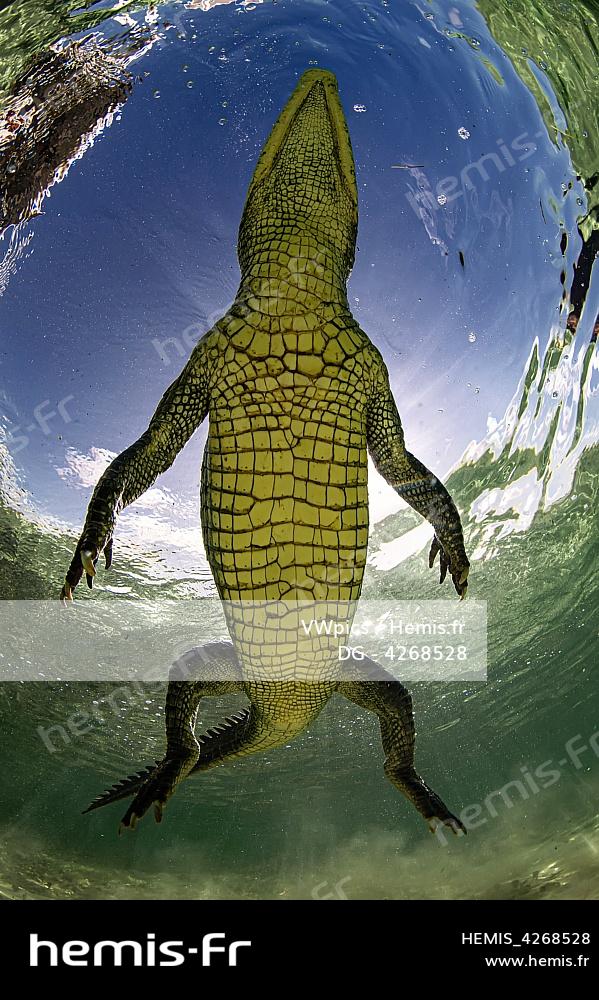 An american crocodile (Crocodylus acutus) in an unusual shot from below, in the shallow waters of Banco Chinchorro, a coral reef located off the southeastern coast of the municipality of Othon P. Blanco in Quintana Roo, Mexico , not far from the Belize border.