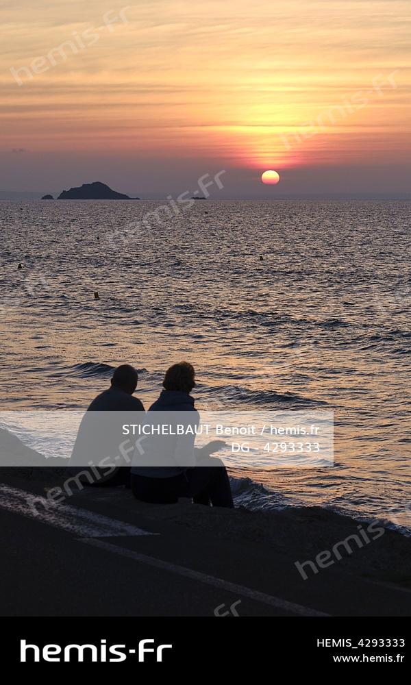 France, Cotes d'Armor, Erquy, a couple watches the sunset on the sea at Saint-Pabu beach