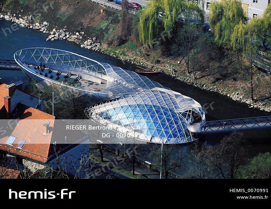 Austria, Styria, Graz, floating island on the river Mur, Cafe and cultural space created by the Architect Vito Acconci