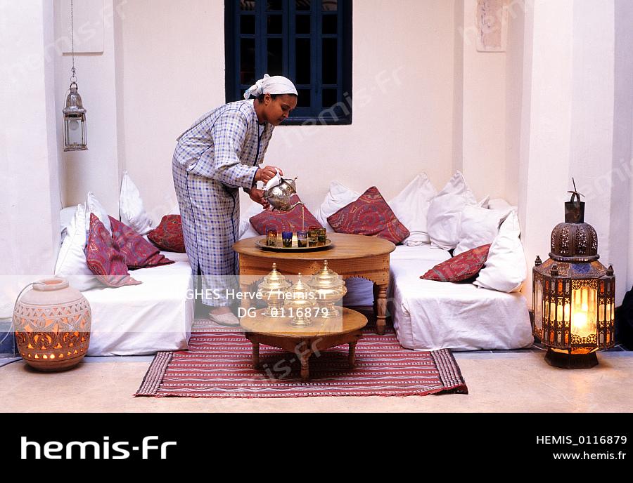 Morocco, Haut Atlas, Marrakesh, young woman serves the tea in Dar Marjana restaurant